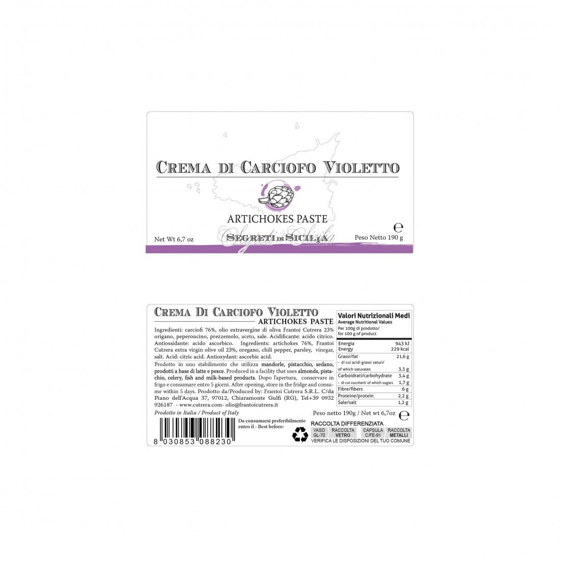 La Crema di carciofo violetto è una ricetta semplice e tradizionale dal gusto delicato ma pieno. Ha un colore verde chiaro e leggere note aromatiche di carciofo e prezzemolo. I carciofi vengono cotti secondo la ricetta dei nostri nonni ma usando metodi di lavorazione innovativi e salutari che mantengono inalterati tutti i nutrienti del prodotto fresco. In pratica, vengono prima scottati in acqua e aceto, poi si aggiungono i condimenti e si realizza la crema.
